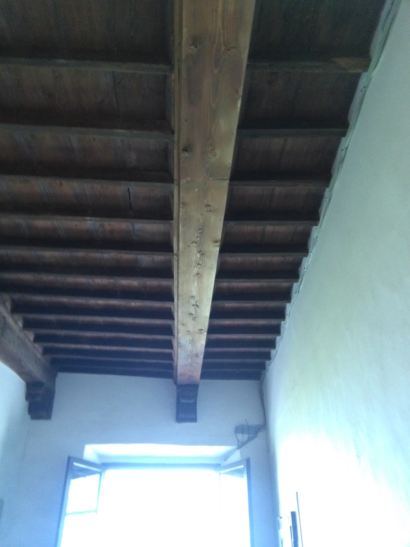 Riconsolidamento trave con inserimento di piatti metallici all'interno della sezione e sulla faccia inferiore, fissati mediante percolazione di resine epossidiche e rivestimento degli stessi mediante ringrosso della sezione con tavole della stessa essenza. Ricreando la trave come se fosse nuova nell'aspetto e aumentandone notevolmente la resistenza.