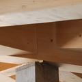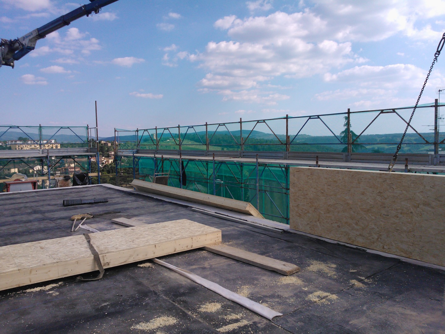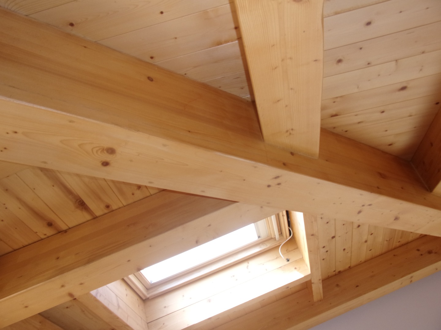 Sopraelevazione di edificio esistente in muratura mediante realizzazione di struttura a telaio con rinfonrzi in fibra di carbonio a sostegno della copertura in lamellare di grandi dimensioni incernierata sulla sommità con giunto a tre vie. La finitura esterna è stata realizzata in continuità con la struttura sottostante. La sopraelevazione in legno ha comportato una notevole diminuzione del peso della struttura in quanto realizzata in sostituzione alla copertura preesistente in cemento ed ha migliorato le prestazioni termiche e sismiche di tutto il fabbricato.